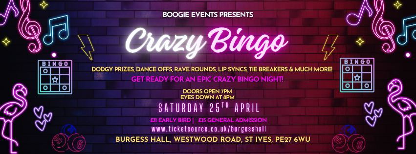 Bingo Bob & Disco Dave are returning to the Burgess Hall on Saturday 25th April for another Crazy Bingo Party!